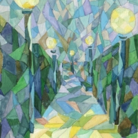 Работа представляет собой светящиеся в сумерках круглые лампы - как это бывает в метро, например.Лампы дают отмсет на кустарник и волшебное ощущение непонятости