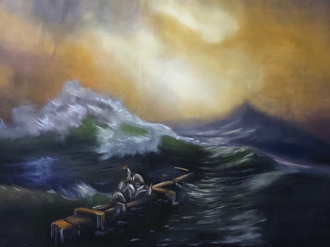 Первая. вид со спины. Старый седой человек раскинув руки стоит на вершине горы. Волосы его развиваются, он медленно рассыпается в прах. вторая. начало прошлого века. Несколько ...