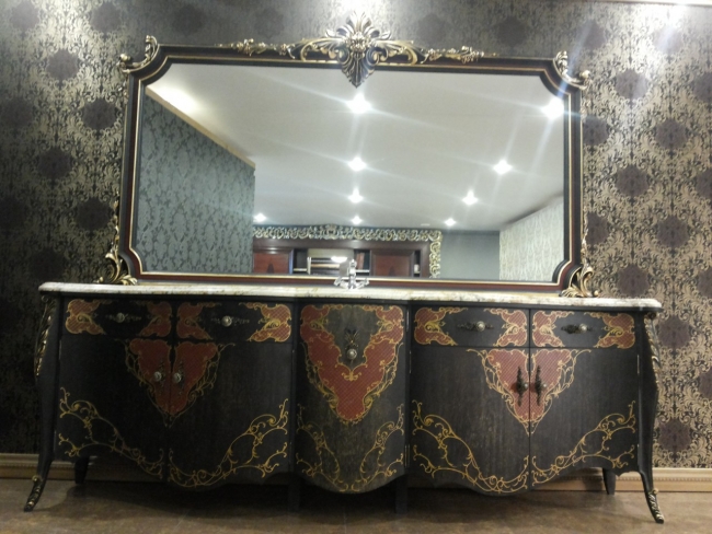 Роспись по комоду и раме для зеркала исполнено в сочетании с золотой краской, патиной, и поталью водными красками. Закреплено лаком.