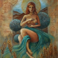 На картине земной, чувственный образ девушки, женщины. Но при всей ее материальности, я очень старалась предать ей невесомость, небесность... Хотелось, чтобы вы почувствовали аромат сандала и мирта...