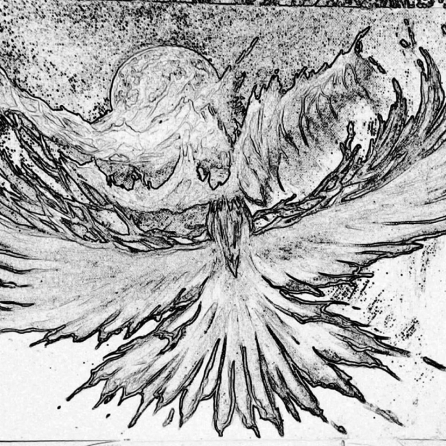 Ночью нахлынул образ силуэтный, из материалов остался единственный холст на картоне уже подготовленный к сюжету и высушенный, но тут птица прилетела, ночью водный силуэт, а в графике огненный феникс.