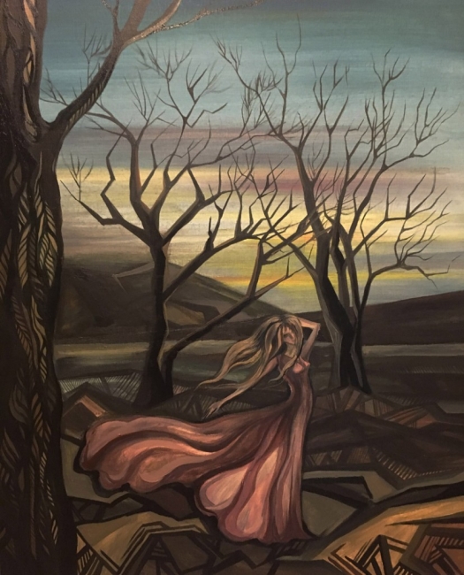 Представленное полотно рассказывает о вечном поиске истины юной ранимой душой. О терзаниях и сомнениях, о тревогах и тайных знаках, которые будучи открытым вселенной, можно видеть во всем. Женский образ, запечатленной в данном сюжете, не безличный: у данного персонажа есть свой прототип . Ее хрупкость, женственность форм и изящность говорят и ее невинности и чистоте, а розово-красное платье о решительности и желании твердо пройти свой путь. Хотелось рассказать о великой силе слабости и хрупкости, о том что будучи нежной и трепетной каждая душа способна вынести любые испытания, получая свой опыт преодоления. Развивающееся платье и светлые волосы девушки вступают в контраст с темными гранеными скалами, высушенными ветвями колючих деревьев, ее нежная розовая кожа так же контрастна темному закатному небу. Написанное мной стихотворение "Она" передает эмоциональное настроение представленной картины.