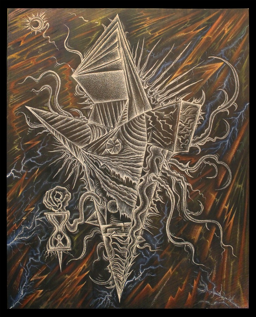 Картина непосредственно относится к недавно начатой серии работ "Боги из бездны " и является первой в этой серии. Здесь я пытался отразить некую необъяснимую беспредельную метафизику, силу извне, перед которыми человеческие переживания, страдания, обиды радости, открытия, мир, наука, на которую молится вся современная цивилизация и тд, абсолютно ничтожны. Но есть некий Фатум, что-то беспредельно высшее, непозноваемое, внушающее ужас, потому-что не понятно на самом деле, добро это или зло и никакие религии по настоящему не могут открыть той пропасти холодного, безразличного ужаса, который смотрит на нас из этой непознаваемой бездны, что в нем кроется и как "оно" к нам относится. И человек здесь просто пешка в безгранично и жестокой игре космоса. Я символически изобразил песочные часы и человека внутри них, которого засыпает сверху песок. Это так же отражает идею, что все мы смертны и как бы мы не барахтались, конец будет один, потому-что мы в руках этой непознаваемой высшей силы, от которой нам не уйти.