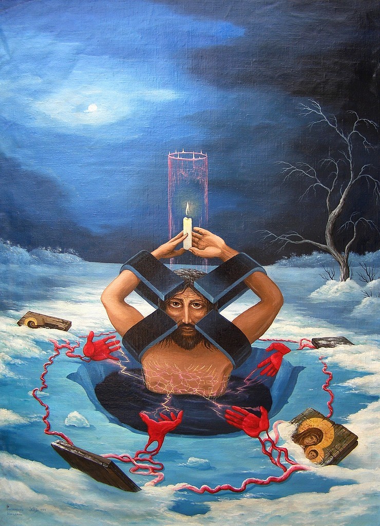 Первая. вид со спины. Старый седой человек раскинув руки стоит на вершине горы. Волосы его развиваются, он медленно рассыпается в прах. вторая. начало прошлого века. Несколько ...
