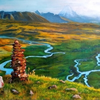 Первая. вид со спины. Старый седой человек раскинув руки стоит на вершине горы. Волосы его развиваются, он медленно рассыпается в прах. вторая. начало прошлого века. Несколько ...