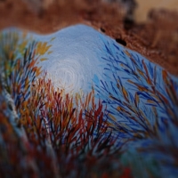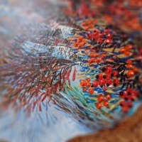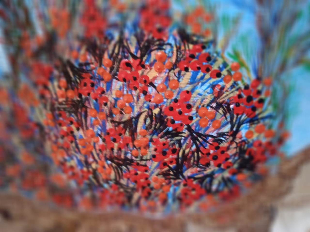 Картина на срезе березы акриловыми красками. На картине изображены березки и ягодный куст, написана работа в авторском стиле - тонкими кистями длинными и короткими черточками, многим кажется что мои работы это вышивка.