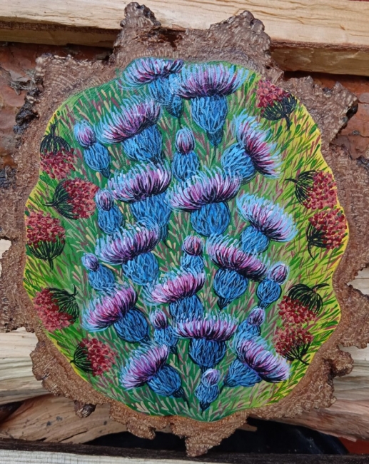 Картина Колючки, для всех любителей синего, и цветов. На картине изображены колючки во всей их красе, а так же трава и авторские ягоды. Картина нарисована на спиле дерева, и покрыта матовым лаком, так же на оборотной стороне есть удобное крепление вешалка.