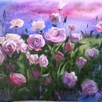 Розовый куст. Закатное солнце освещает красивые цветы. Удивительный цвет! Некая загадочность и мистичность этих цветах!