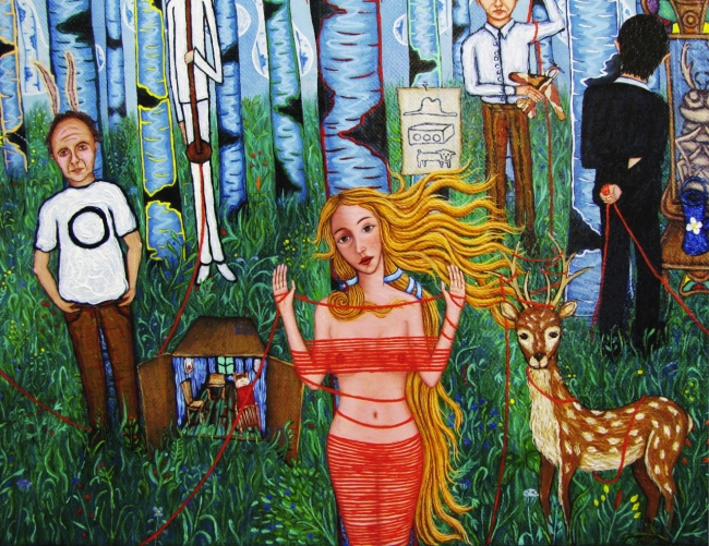 С самого начала эта идея казалась глупой. Ариадна убедила каждого привязать себя обрезком красной нити к ближайшему дереву, чтобы не нарушать личных границ коллективного перформанса. Мы никогда не заблудимся в этом лесу! Как бы по секрету сообщала она каждому участнику эту безумную фразу своим красивым грудным голосом. Декорации были готовы: пару десятков картин и несколько инсталляций за сотню километров от цивилизации. Преодолевая неловкость и ощущение абсурдности происходящего они заняли свои места на импровизированной сцене. Каждый следовал заготовленной роли и постепенно их слаженные движения стали более свободными и уверенными. Полностью отдавшись представлению они перестали замечать происходящее вокруг. Стемнело. Закончив, они не сразу пришли в себя и начали осознавать произошедшие вокруг перемены. Из сумрака на них смотрели сотни внимательных глаз.