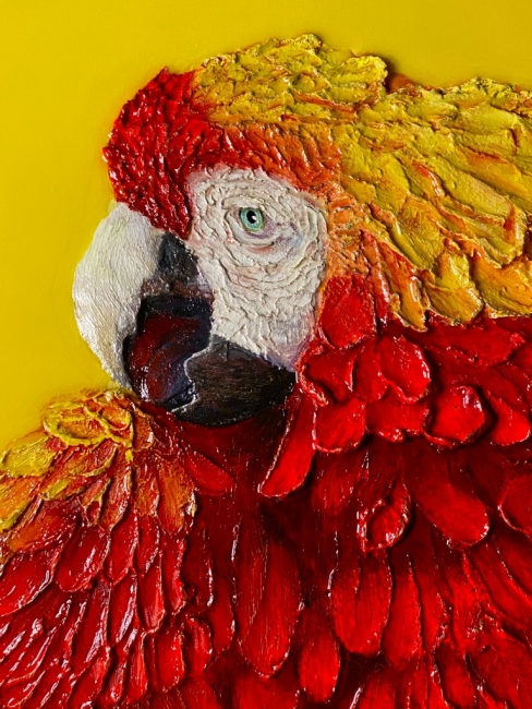 Картина очень яркая, сочная. На ней я изобразила яркого попугая Ара, картина очень объёмная, фактурная. Весит такая картина около 5 кг.