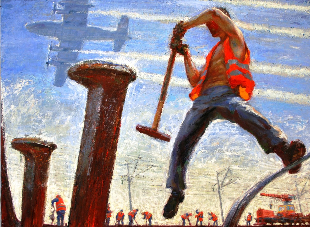 На картине монтёр железнодорожных путей выполняет одну из самых трудоёмких операций при ремонте железной дороги. Это замена старых деревянных шпал на новые. В конце процесса в новую, пропитанную креозотом шпалу забивают костыли. Сменная норма на одного путейца — 24 шпалы за 8-часовой рабочий день.