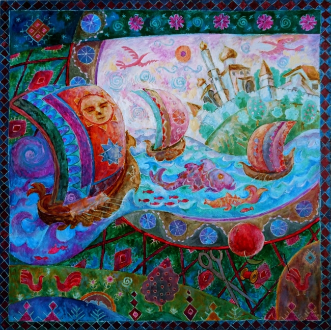Декоративная живопись по мотивам славянских сказок и легенд. Новый мир открывается нам на серебряном блюдечке, волшебный остров и неведомые рыбы окружают его. Волшебный мир соприкасается с нашим миром, миром жизни людей, ножницы, иголка и вышивка в углу говорят о том что каждый из нас творец способен творить свой собственный мир. В картине изображено много природных символов и орнаментов, которые говорят о гармонии мира природы. Картина написана в авторской декоративной технике с применением текстурной пасты.