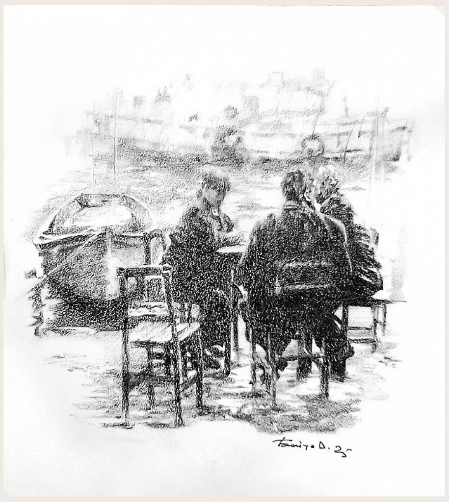 Первая. вид со спины. Старый седой человек раскинув руки стоит на вершине горы. Волосы его развиваются, он медленно рассыпается в прах. вторая. начало прошлого века. Несколько ...