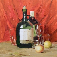 натюрморт, бутылки и стаканы, пустые, яблоки, красная ткань