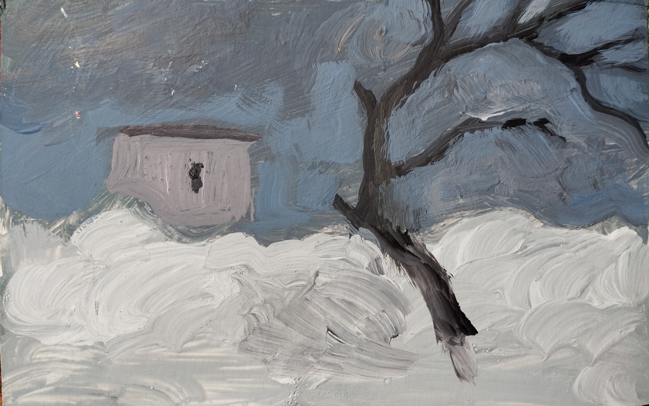 Дерево, дом, небо и снег