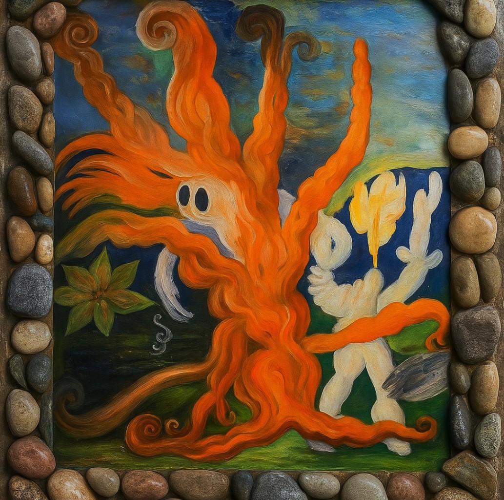 Первая. вид со спины. Старый седой человек раскинув руки стоит на вершине горы. Волосы его развиваются, он медленно рассыпается в прах. вторая. начало прошлого века. Несколько ...