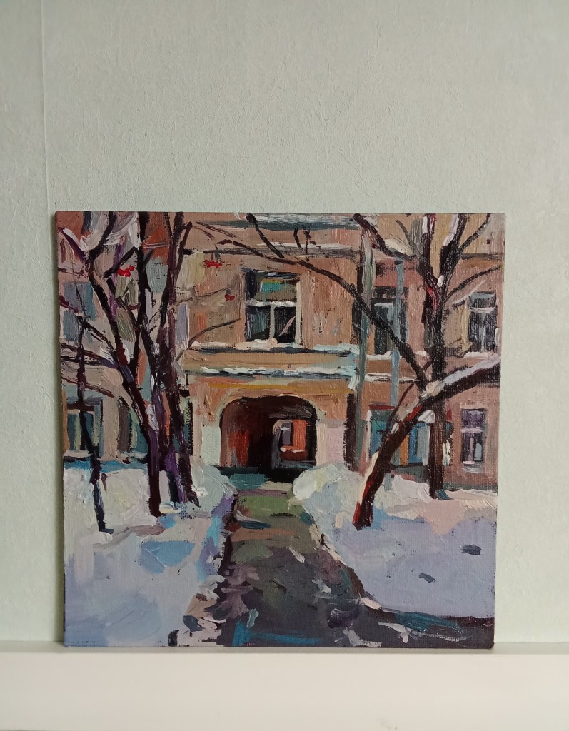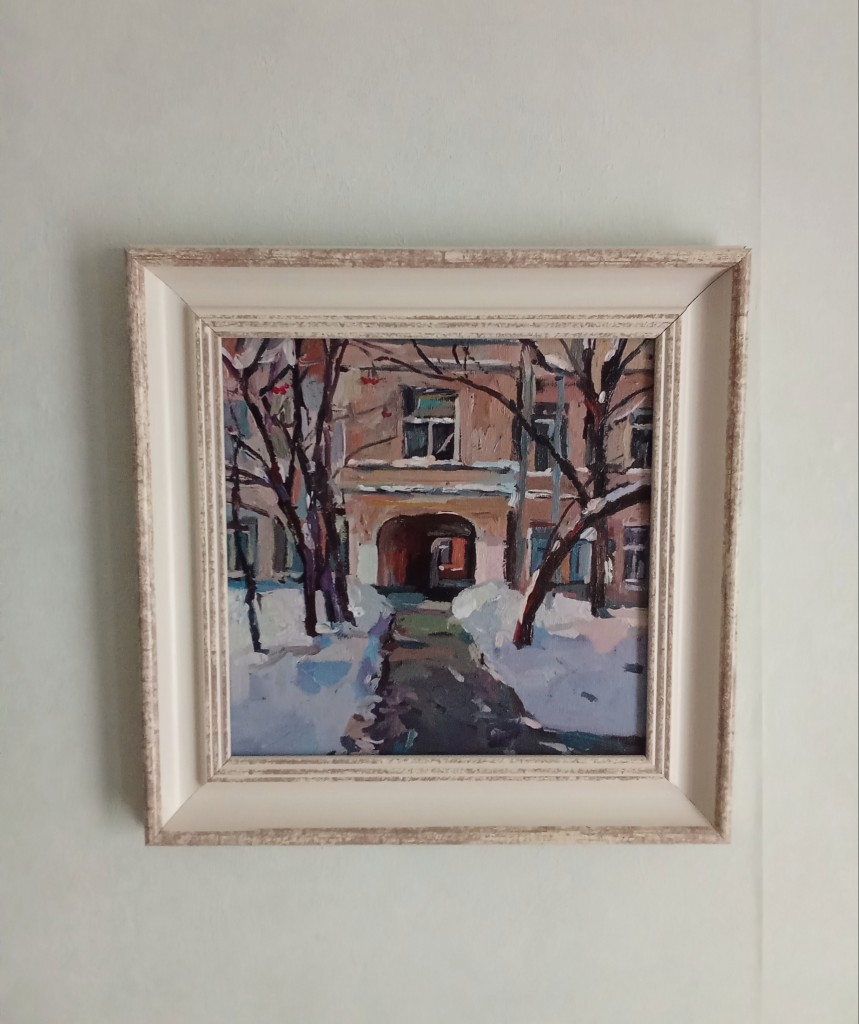 На картине отображается зимняя Москва в центре города на Цветном бульваре
