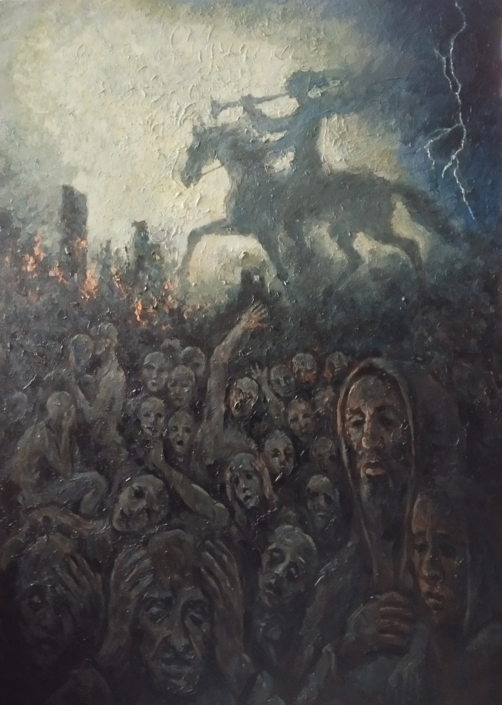 Первая. вид со спины. Старый седой человек раскинув руки стоит на вершине горы. Волосы его развиваются, он медленно рассыпается в прах. вторая. начало прошлого века. Несколько ...