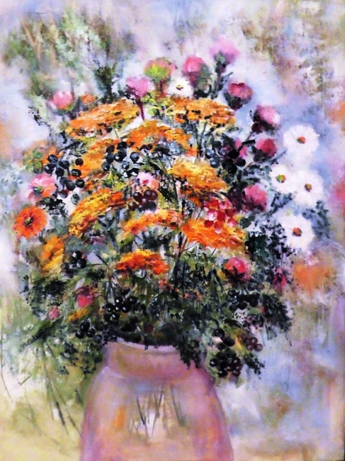 картина цветы натюрморт живопись холст масло полевые цветы в вазе соцветья пижмы васильки ягоды ромашки