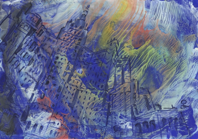 Радужный поток красок монотипии освещает уходящую ввысь Сталинскую высотку, создает ощущение праздника