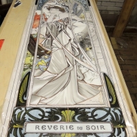 Авторская интрепритация известного сюжета Альфонса Мухи . В ответ на принты и попытки создавать витражи по графическим листам автора . Выбрана самая правильная методика .