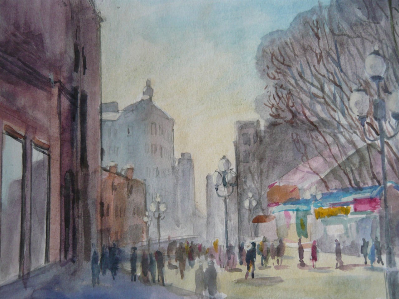 Городской пейзаж акварелью Арбат,размер 20х30 работа не оформлена.