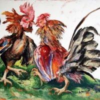Петушки-забияки. Соперники сошлись в поединке. Перья поредели, гребешки пообвисли.