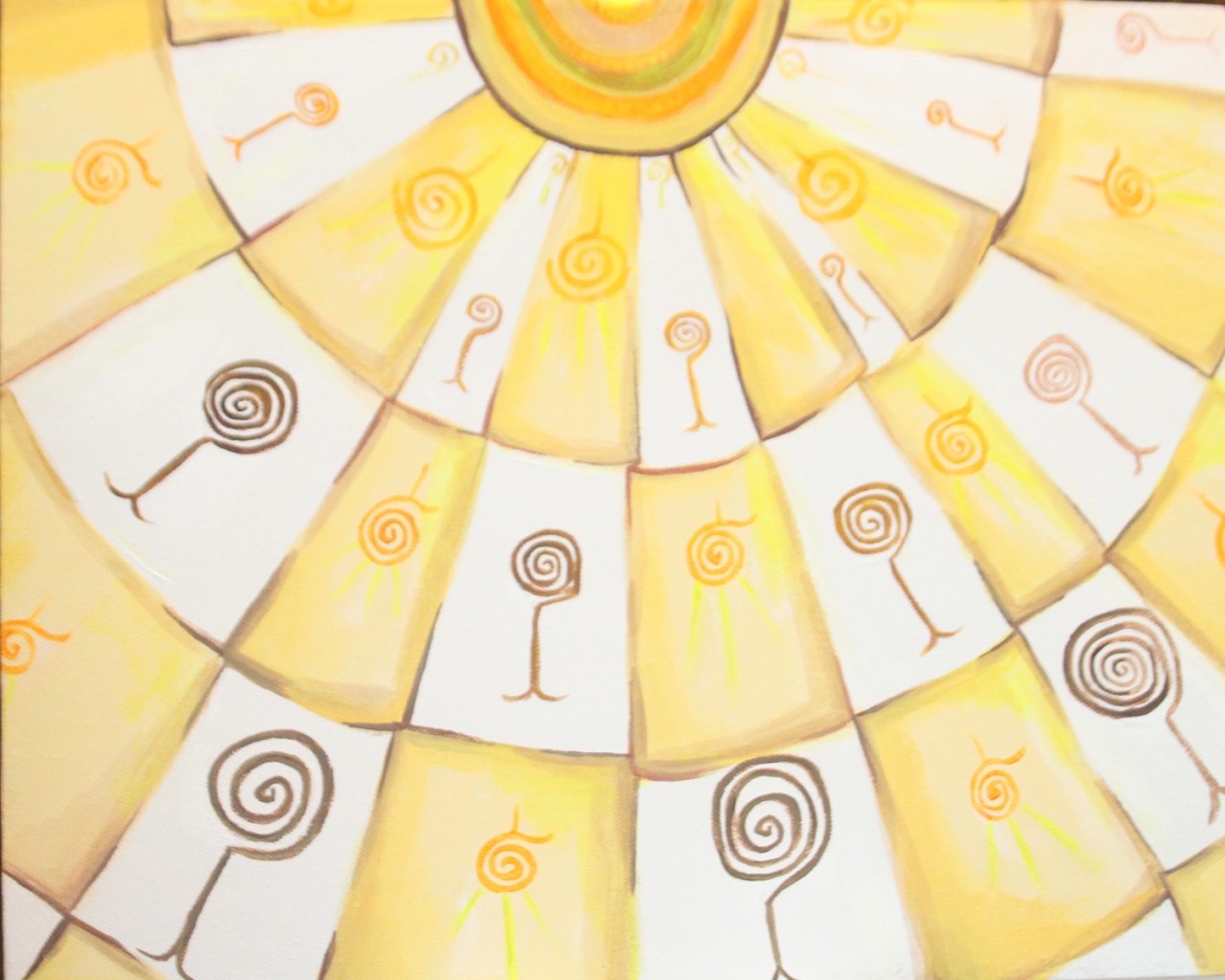Апрель пробудил в людях душевное тепло и надежды на лучшее будущее. Я видела на улицах города много улыбающихся людей, смотрящих на Солнце. Я видела деревья, которые были готовы раскрыть листья под солнечными лучами. Весну и Солнце я перенесла на холст, желая передать позитив зрителю.