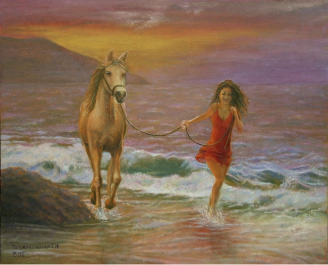 Бегущие по волнам: девушка в красном, насквозь промокшем от соленых волн платье, с улыбкой на губах, и в унисон стучащая копытами, вслед за ней, белая лошадь с развевающейся на ветру гривой.