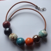 Бусины для данного колье вылеплены мной вручную из красной и белой глины. Они полые, прошли высокотемпературный обжиг. Покрыты немецкими глазурями.Бусины собраны на кожаный шнур.