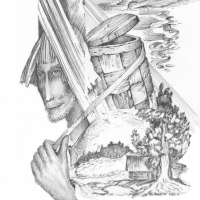 Первая. вид со спины. Старый седой человек раскинув руки стоит на вершине горы. Волосы его развиваются, он медленно рассыпается в прах. вторая. начало прошлого века. Несколько ...