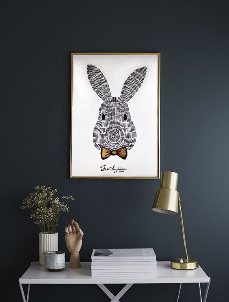 "Белый кролик" - Эта картина родился из найденного мной упражнения для детей, от ребенка требовалось аккуратно заполнить черточками пространство морды кролика, задание это направлено на развитие аккуратности и подготовку руки к письму. Мне же как художнику, не страдающему особой усидчивостью и аккуратностью, стало интересно попробовать свои силы в этом упражнение! Так появился на свет мой "Белый кролик"! Этот "милаха", наряжен золотым галстуком - бабочкой и станет отличным украшением детской комнаты.