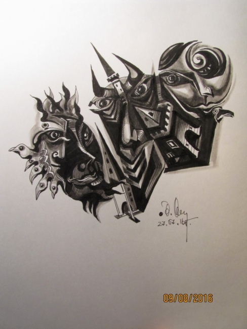 Первая. вид со спины. Старый седой человек раскинув руки стоит на вершине горы. Волосы его развиваются, он медленно рассыпается в прах. вторая. начало прошлого века. Несколько ...