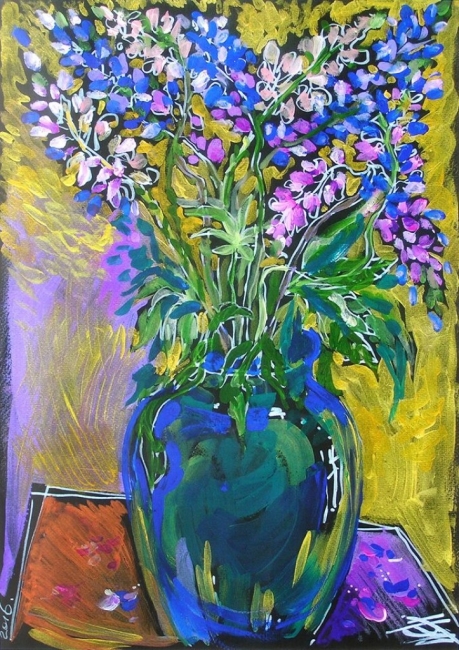 Декоративный живописный натюрморт в авторской технике (акрил+цветные потали, холст на подрамнике. Название цветов люпина обыгрывается как китайское имя ЛЮ-ПИН :), вызывая у зрителя гармоничные, положительные эмоции. Созерцание оригинала картины имеет ярко выраженный арт-терапевтический эффект ( гармонизирует психоемоциональное состояние зрителя). Автор - профессиональный художник-экрааналитик, сертифицированный арт-терапевт.