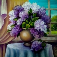 Картина маслом на холсте и на подрамнике холст. На картине изображен букет цветов сирени в вазе на фоне городского пейзажа.