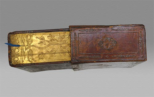 Но на написании работа над книгой не заканчивалась. Необходимо было сшить страницы, выровнять их обрезом и сделать обложку. Книжные обрезы часто покрывались золотом, что придавало древней книге ещё большую ценность и красоту, но, что важнее – золото защищало края страниц от разрушения. Кроме того, на обрезах делалось тиснение с геральдикой, указывавшей на принадлежность книги, например, королевской семье.