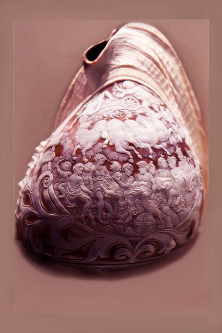 В 14 веке искусство глиптики добирается до морских раковин и оказывается, что геммы, сделанные на таком простом и дешёвом материале, как перламутр, ничуть не хуже, чем на полудрагоценных камнях, их полупрозрачные просвечивающие на солнечном свете рельефы завораживают нежностью и переливами оттенков.