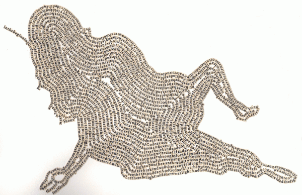 Отдельные буквы приклеиваются к бумаге в непрерывную линию без пробелов и знаков препинания для того, чтобы препятствовать буквальному прочтению текста. Объединив священные писания различных религиозных конфессий, я создаю гобелен, который выходит за пределы однобокого визуального восприятия. Это специфическая возможность почувствовать необходимость универсальности и взаимосвязи всего того, что несколько больше, чем мы сами. Так я создаю визуальную мантру общечеловеческого понятия о святости и преданности богу.