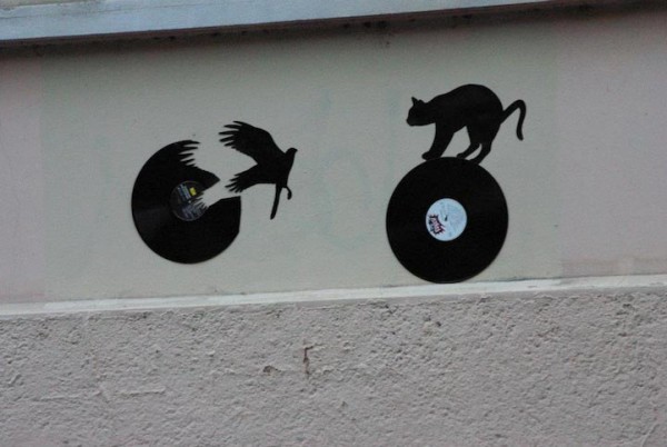 Лион, Франция – родина этого художника, который впервые появился на граффити-арене в 1996 году. Он повторно использует черные виниловые пластинки в качестве силуэтов тех животных, которые наделены прекрасной возможностью летать. Каждая инсталляция представляет различные сцены побега и свободу от жестких бетонных стен. Свои творения художник явно создавал под впечатлениям от окружающей городской среды и тех существ, что в ней обитают.