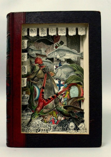 Художник не добавляет в книги ничего, кроме того, что там уже было. Скупая антикварные иллюстрированные томики энциклопедий, он удаляет обычными ножницами всё то, что считает несущественным, оставляя фрагменты, которые и выстраиваются затем в разноцветную визуальную мозаику.