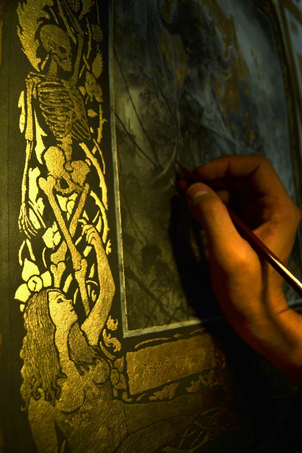 Своеобразное сочетание сусального золота и монохромного изображения сцены или портрета, прорисованных со множеством деталей, одним графитным карандашом или с затемнениями пятен тушью – стало визитной карточкой художника.
