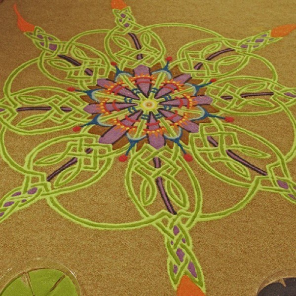 Импровизируя всякий раз, он создаёт мандлы, без предварительной разметки, а все цвета и линии «считывает» в своём сердце. Яркие, сочные, невероятно жизнерадостные цветовые сочетания в нарисованных песком мандалах от Джое Мангрума сплетаются в энергетические вихри его эмоционального состояния.