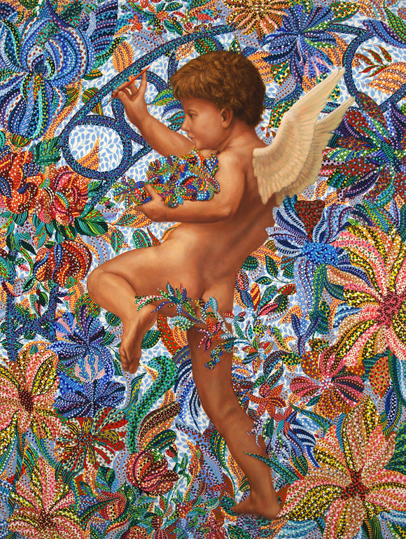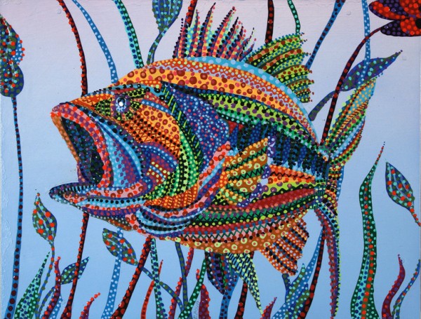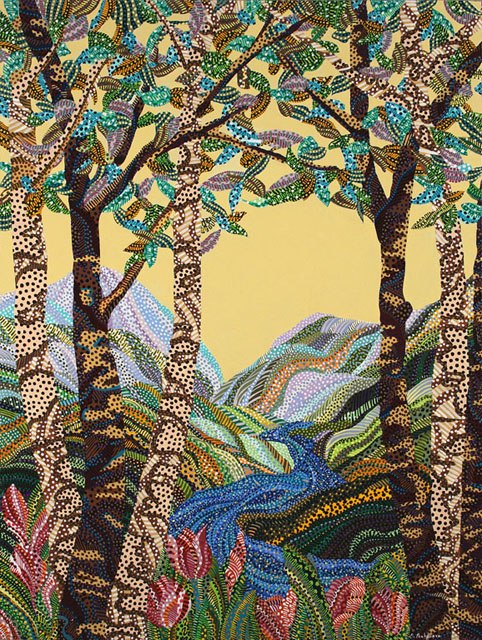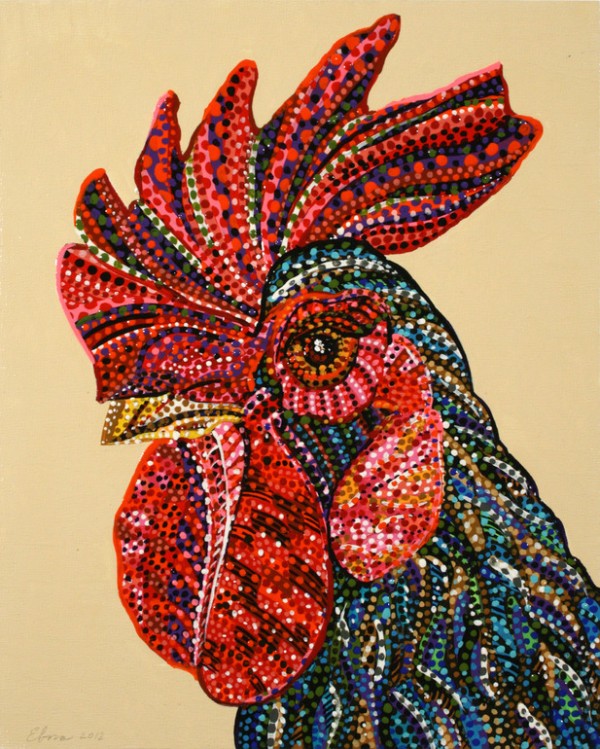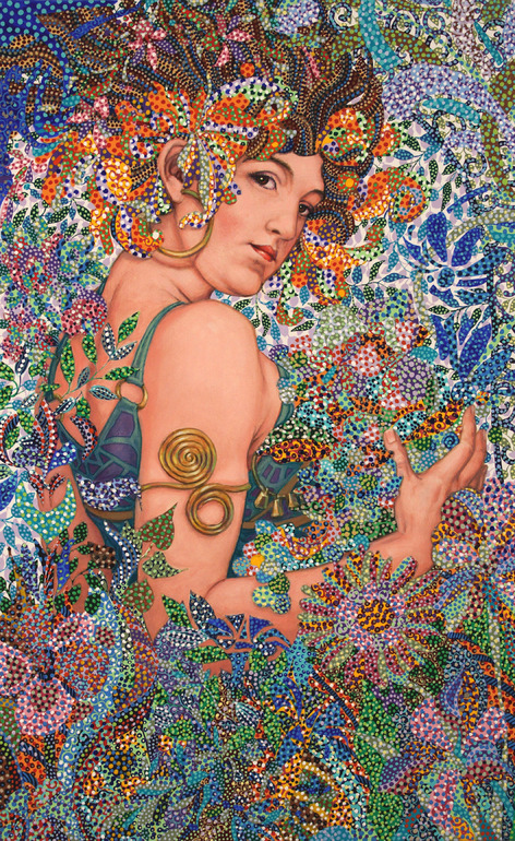 Можно говорить о медитативности такой техники изображения, ведь Эрика использует для создания сюжета или образа многие точки, которые образуют единое колористическое пятно только если рассматривать картину на расстоянии.