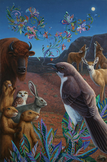 «Мне нравится изображать знаки, символы и природные явления, которые сосуществуют в мире согласия и взаимного утешения. Я пытаюсь напомнить моим зрителям то чудесное детское чувство, которое испытываешь при встрече с чем-то новым и красотой природы».