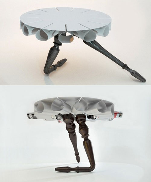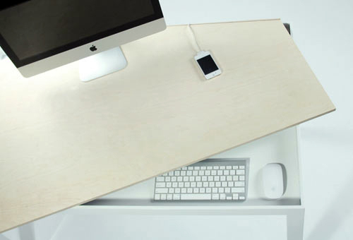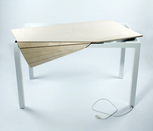А вот весьма креативный дизайн стола, поверхность которого может быть повернута и смещена в любую сторону под разными углами и трансформирована за счёт подвижных секционных панелей, благодаря чему можно с максимальным комфортом размещать различные предметы (журналы, тетради и другие канцелярские принадлежности). Кроме того, полая внутренность самого стола и его ножек позволяет «спрятать» в них различные провода, которые, как известно, не слишком то украшают интерьеры современных квартир. Но, наконец-то, грамотный дизайн стола позволяет решить проблему с кучей проводов разбросанных по всему пространству вокруг стола. Вуаля!