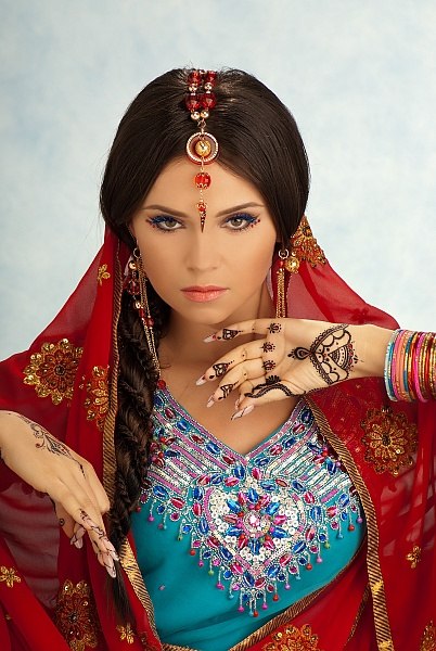 Маникюр в переводе с латыни обозначает «уход за руками», но свадебный маникюр для индийской невесты – это не только обработка ногтей, которые полируются и покрываются нежнейшими оттенками лака, имитирующими настоящий цвет здоровых ногтей, но и украшение пальцев и кистей рук затейливыми узорами хной, заваренной на кофе - менди. Довершают образ настоящей принцессы - наклеенные на кожу стразы и многочисленные золотые или серебряные серьги, кольца и браслеты.