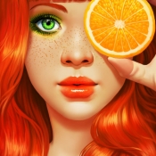 Несмотря на присутствие в её творчестве готически-мрачных сюжетов, где мрачные тона отягощают сознание, вносят деструктивность, всё же основная тональность характера её персонажей можно охарактеризовать, используя вполне художественное определение, а именно – цвет. И цвет этот- оранжевый. Апельсиновые ноты вплетаются в складки одежды и волосы, в отблески на заднем фоне.