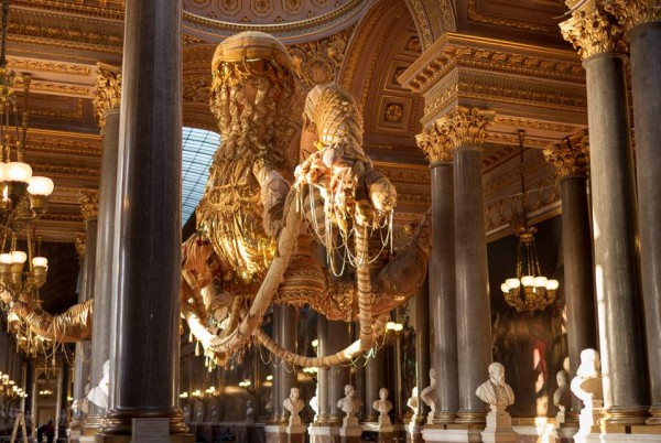 Огромная люстра, 6 м высотой, сделанная из женских гигиенических тампонов под потолком Версальского зала, гигантские чайник и кувшин из проволоки и скульптура, составленная из синих бутылок из-под шампанского в Версальском саду, салфетка, размером с чехол для автобуса, украсившая пролёты металлического моста…