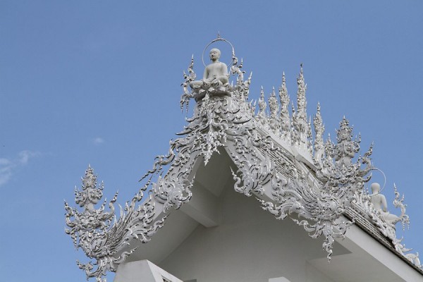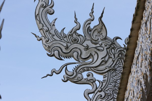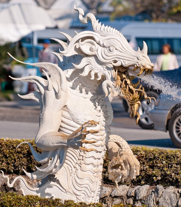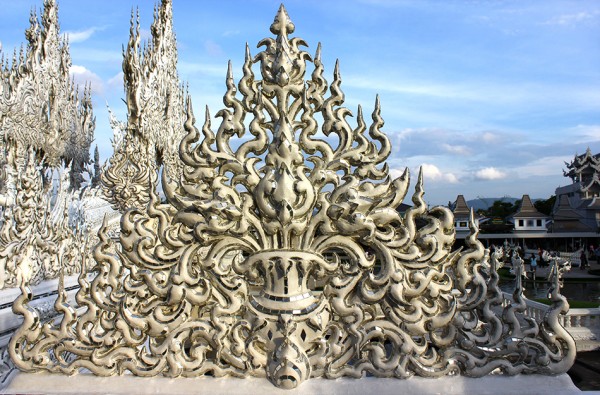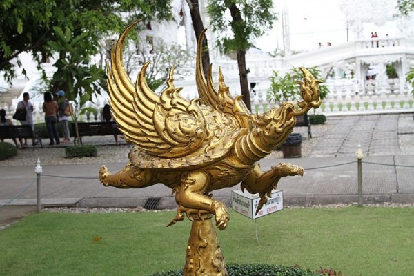 Окружает всё это великолепие храма Wat Rong Khun обширный и ухоженный сад с дорожками, беседками, фонтанами и белоснежными и золотыми скульптурами. Среди скульптур милые принцессы, мифические животные, изваяние правителя Менграя, основавшего город Чианграй.