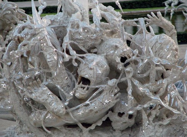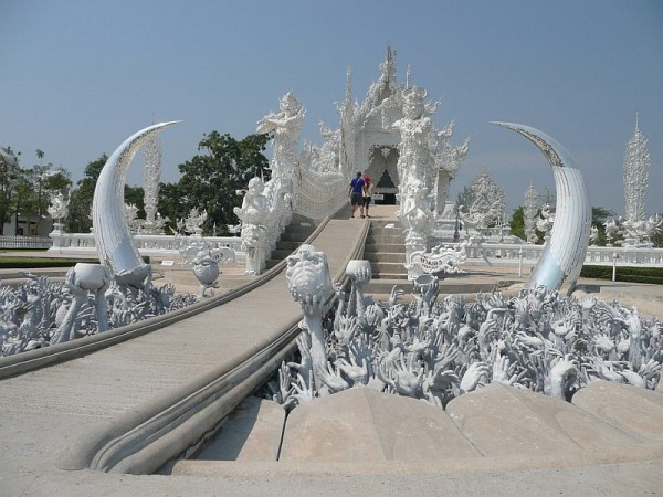 Весьма незавуалированная символика у моста, который направляет туристов прямо к храму Wat Rong Khun. При этом дорога предполагается через мост лишь в одном направлении. А всё потому, что это – дорога в рай. А точнее – тропа сомнений и страданий: мост пролегает через интерпретацию бездны ада, из которой тянутся в отчаянии руки грешников, просящих милости и прощения.